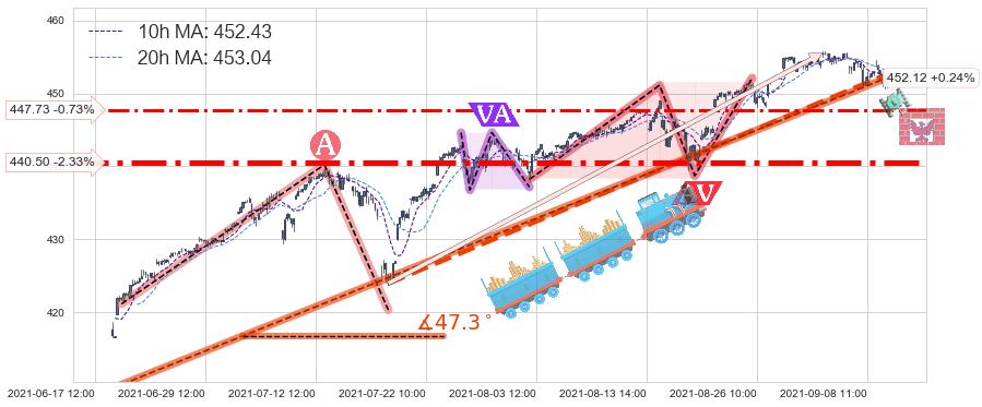 🍖 长线趋势跟踪组合短线均值回复[强支撑信号]2021-06-18 14:00-2021-09-09 13:00上升趋势依然成立(上涨趋势跟踪依然可行),短线价格略微下行回调(均值回复猜想),即将接近趋势提供的未破位的支撑价格:452.12。