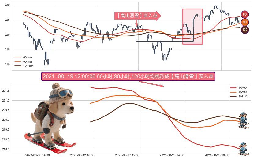 ⚀ 2021-08-11 14:00:00小时-2021-08-26 15:00:00小时显现 60小时-90小时-120小时均线 【高山滑雪】买入点 看多信号,后市看涨,买入
