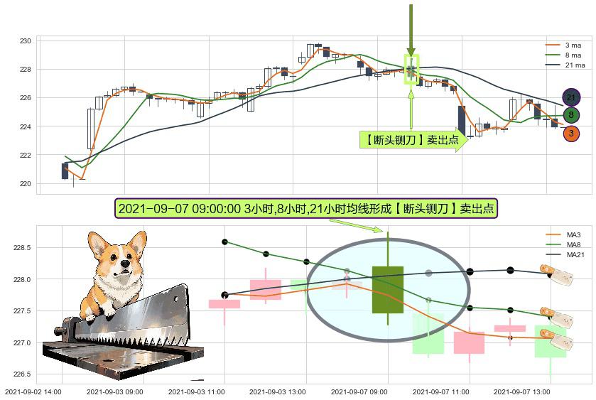 ⚀ 2021-09-07 09:00:00小时显现 3小时-8小时-21小时均线 【断头铡刀】卖出点 看空信号,后市看跌,卖出