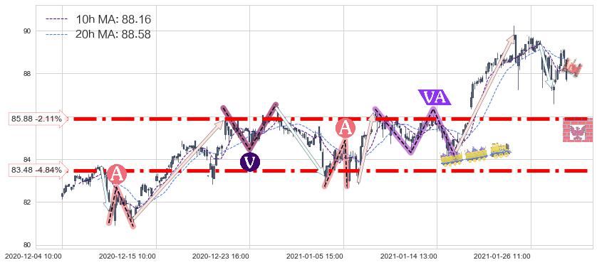 ♘ 支撑价格位85.88,可信任强度91.18%,距离最后交易2021-01-28 16:00形成的收盘价格87.73相差 -2.11%