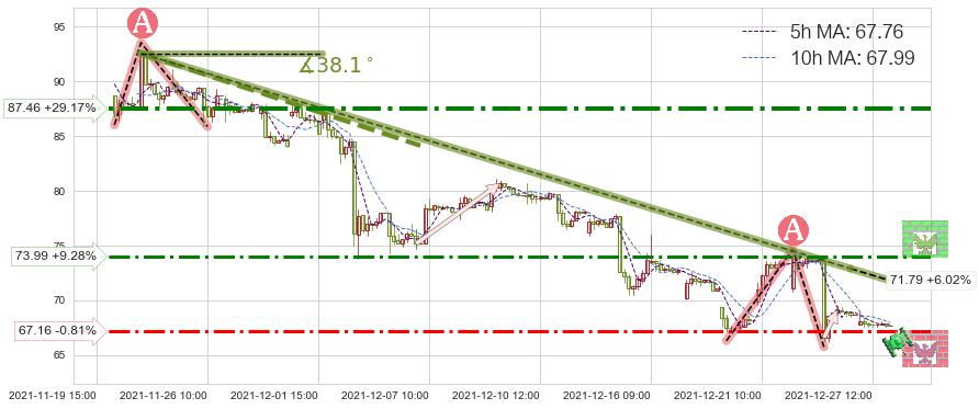 ♘ 在最后的下跌阶段2021-11-23 09:00至2021-12-23 15:00,存在 持续未破位的阻力位 ,阻力价格71.79,可信任强度85.46%,其距离最后价格67.71相差 +6.02%