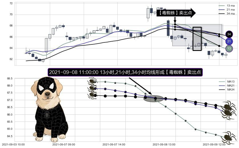 ⚀ 2021-09-08 11:00:00小时显现 13小时-21小时-34小时均线 【毒蜘蛛】卖出点 看空信号,后市看跌,卖出