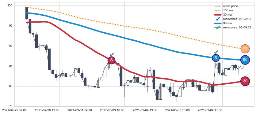 ⚃ 第⑧卖出点 刚刚再次破位下穿均线, 阻力 效果并未十分稳固,属于【激进】的卖出信号,高时效看空信号