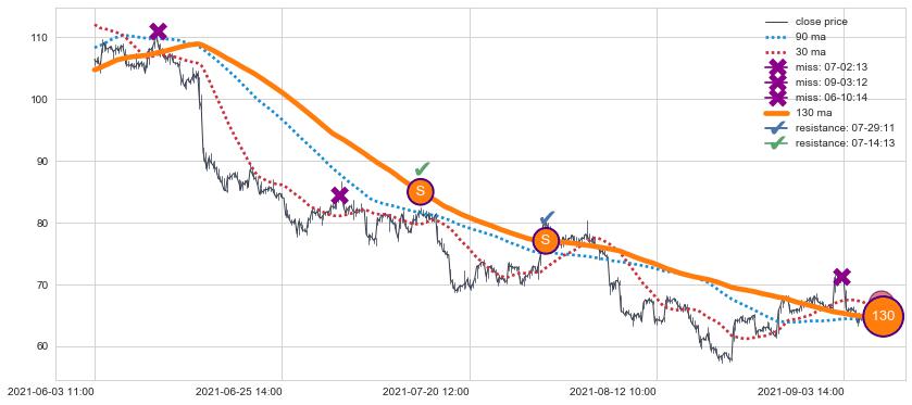⚅ 卖点向下突破均线后,价格走势有持续向下的迹象,但动能稍显不足,迟迟不能远离均线