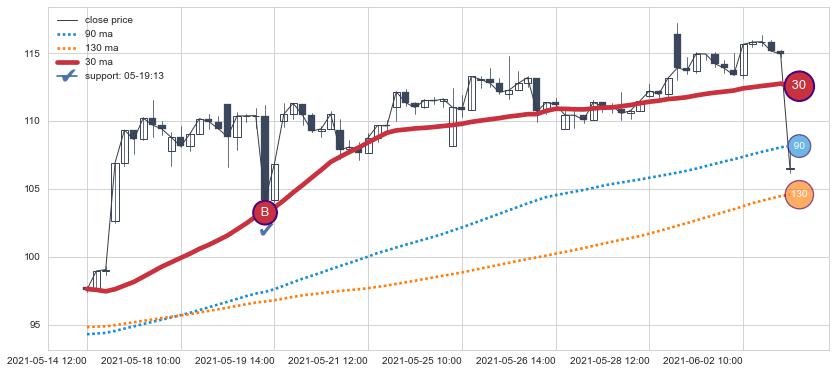 ⚀ 2021-08-05 14:00:00小时-2021-08-30 14:00:00小时显现 60小时-90小时-120小时均线 【高山滑雪】买入点 看多信号,后市看涨,买入