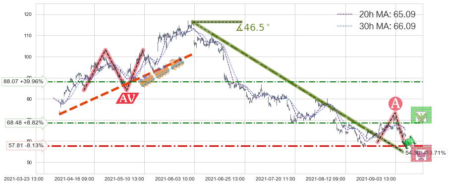 ♞ 20小时均线:65.09,30小时均线:66.09→ 快线<慢线