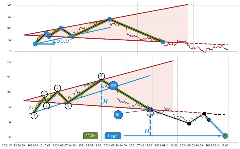 从2021-06-10 14:00至2021-08-27 12:00,共包含336个小时,阶段股价下跌-45.03%,阶段股价变动位移路程比: 1 : 7,下跌趋势角度: 46.6