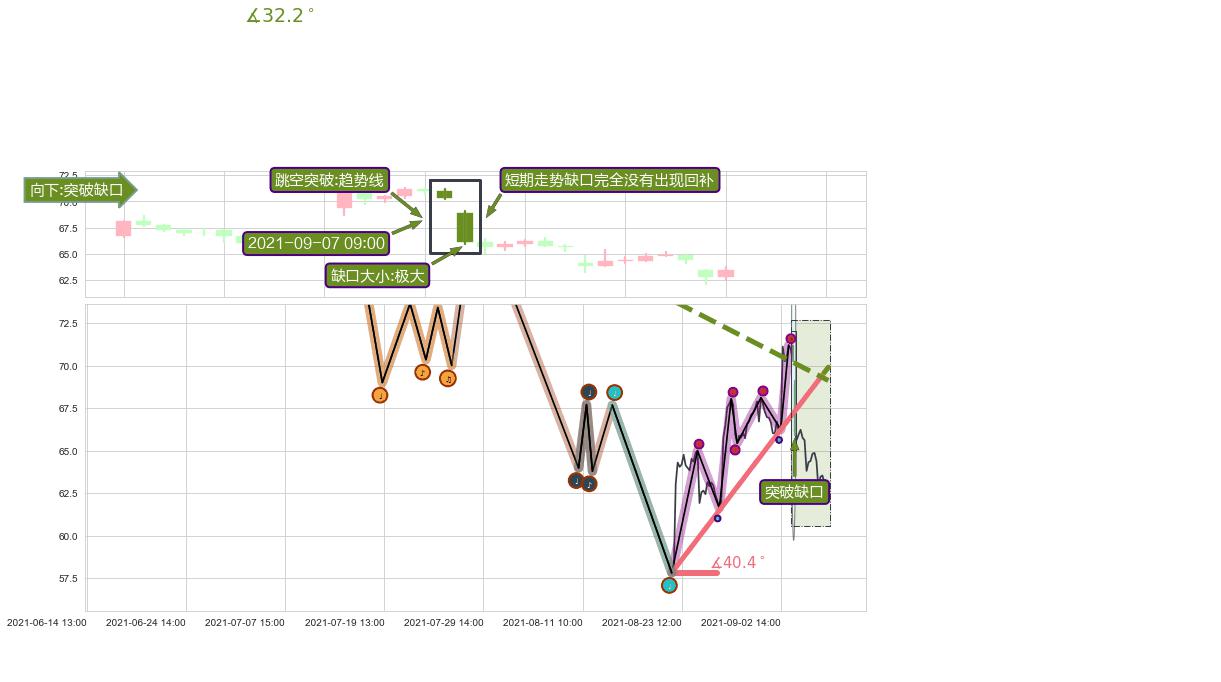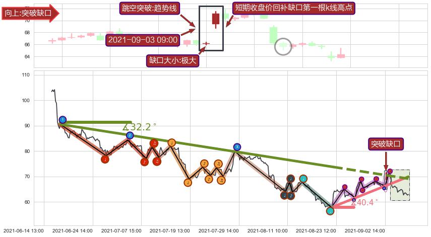 ➣ 2021-08-20 13:00-2021-09-09 12:00上升趋势存在反转[风险],其原上升趋势的支撑位(69.91)已破位[强阻力信号],原上升趋势角度: 40.4˚