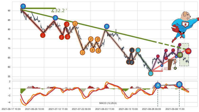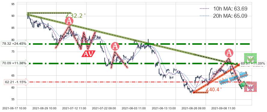 ➢ 2021-06-17 12:00-2021-08-23 09:00下跌趋势存在反转上涨[机会],其原下跌趋势的阻力位(69.13)已被突破[强支撑信号],原下跌趋势角度: 32.2˚