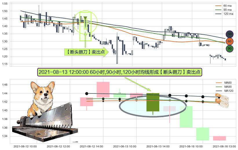 形态多维评估: ⚀ 2021-08-13 12:00:00小时显现 60小时-90小时-120小时均线 【断头铡刀】卖出点 看空信号,后市看跌,卖出