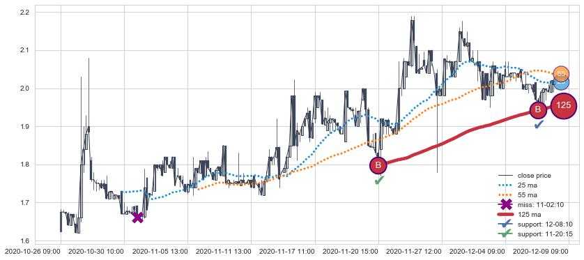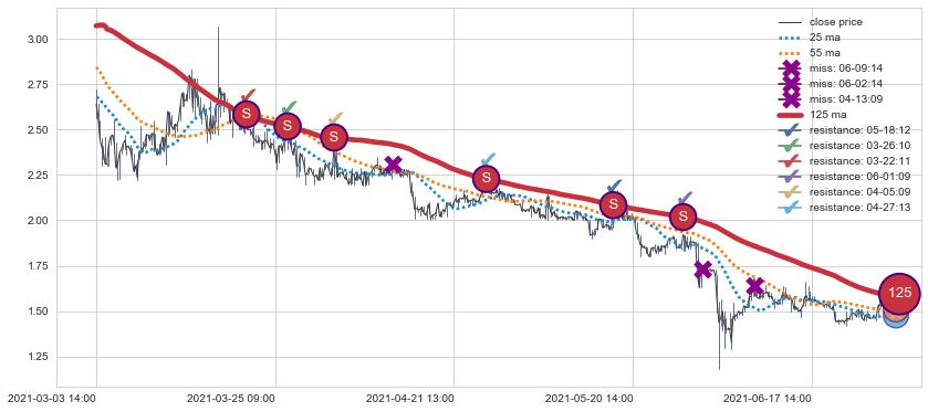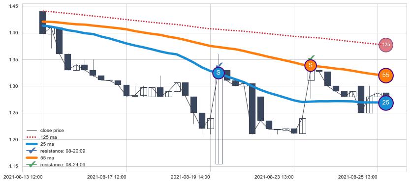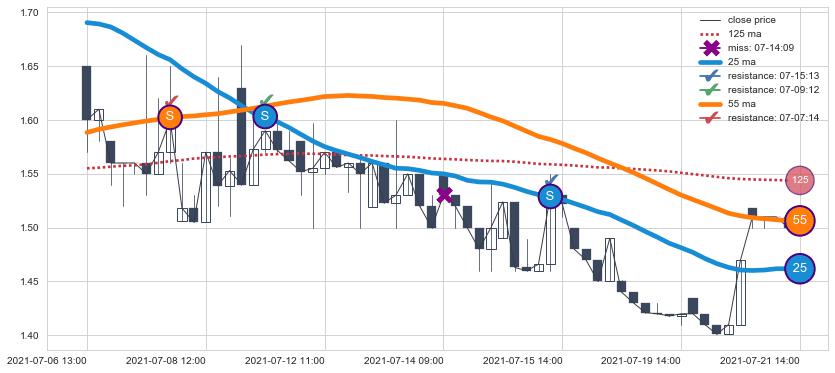 下跌趋势07-06 13:00-07-21 14:00,均线25, 55确认关键阻力3处