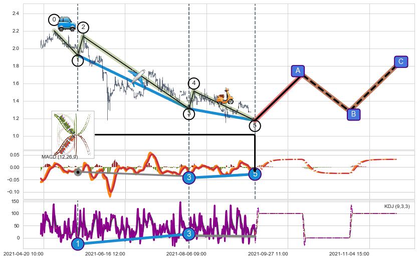 | 8 🅚:降势受阻 ➕ 🌊:波浪理论猜想下跌浪5已形成,猜想后续形成abc反弹上涨(均值回复) ☞ 看多信号 ⇥ 【🅚线】交织【图形】⇥ 综合量化分数: 55 | > |