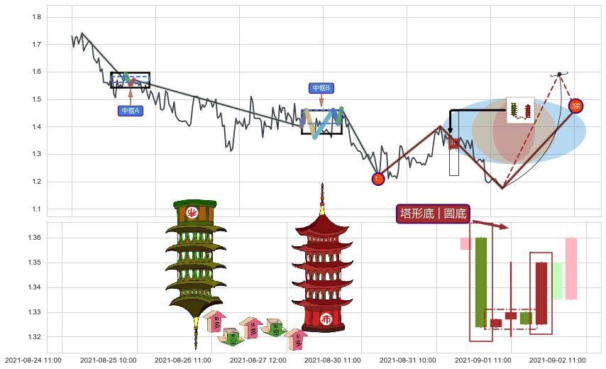 ➣ 【中枢B】:08-05:14-08-12:14,中枢由6笔构成,共25交易小时, ZG=1.4600, ZD=1.4100