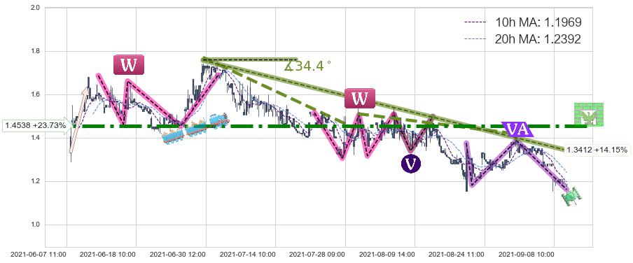 从2021-07-29 12:00至2021-08-30 09:00,共包含110个小时,阶段股价下跌-8.73%,阶段股价变动位移路程比: 1 : 21,下跌趋势角度: 17.5