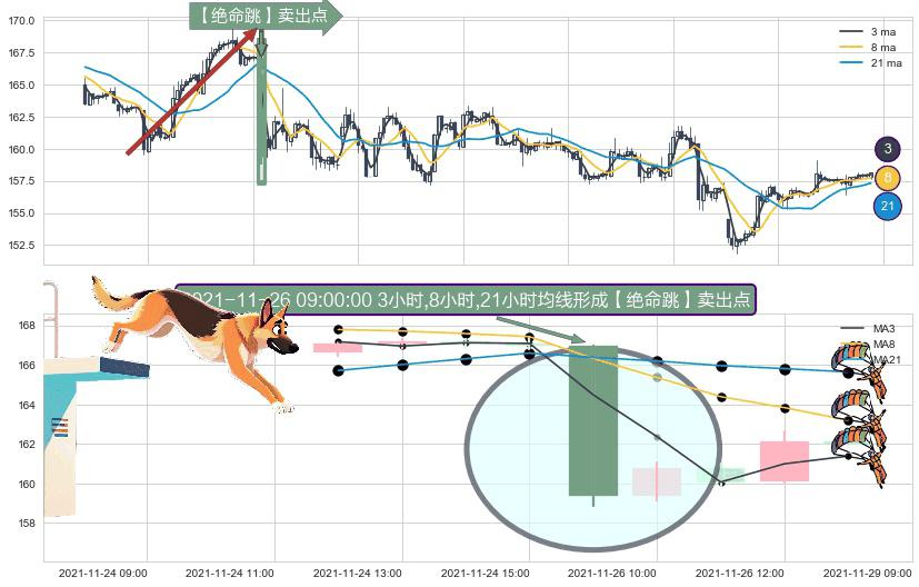 形态多维评估: ⚀ 2021-11-26 09:00:00小时显现 3小时-8小时-21小时均线 【绝命跳】卖出点 看空信号,后市看跌,卖出