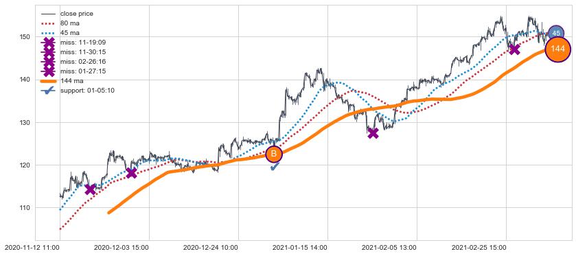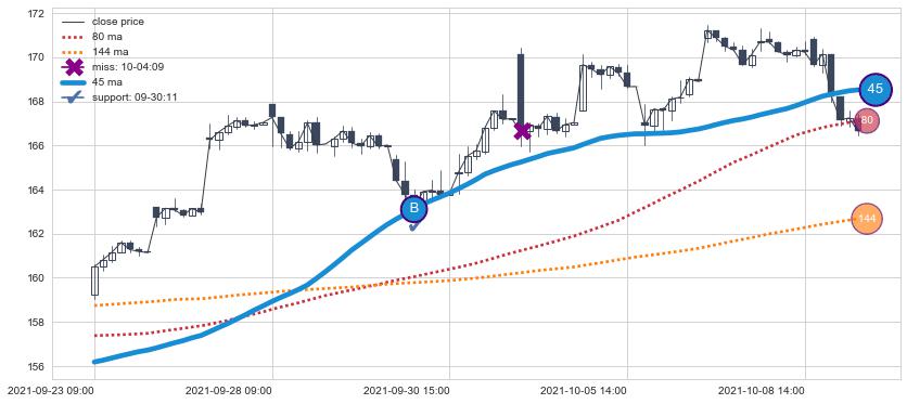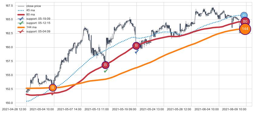 上涨趋势04-28 12:00-06-09 10:00,均线80, 144确认关键支撑3处