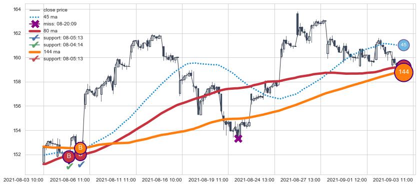 上涨趋势08-03 10:00-09-03 11:00,均线80, 144确认关键支撑2处