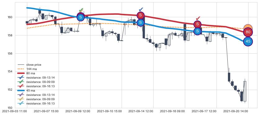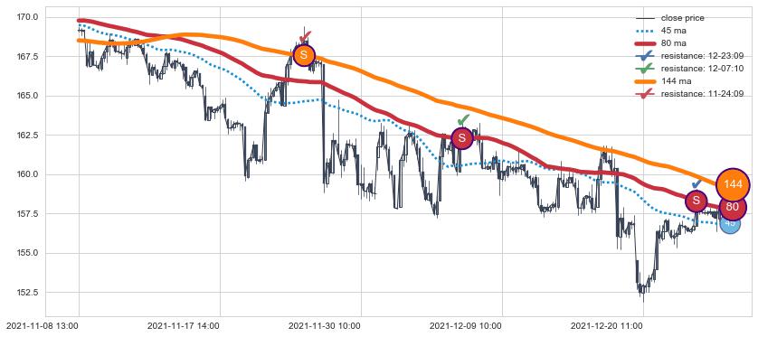下跌趋势11-08 13:00-12-27 10:00,均线80, 144确认关键阻力3处