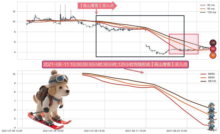⚀ 2021-07-22 09:00:00小时-2021-08-30 13:00:00小时显现 60小时-90小时-120小时均线 【高山滑雪】买入点 看多信号,后市看涨,买入