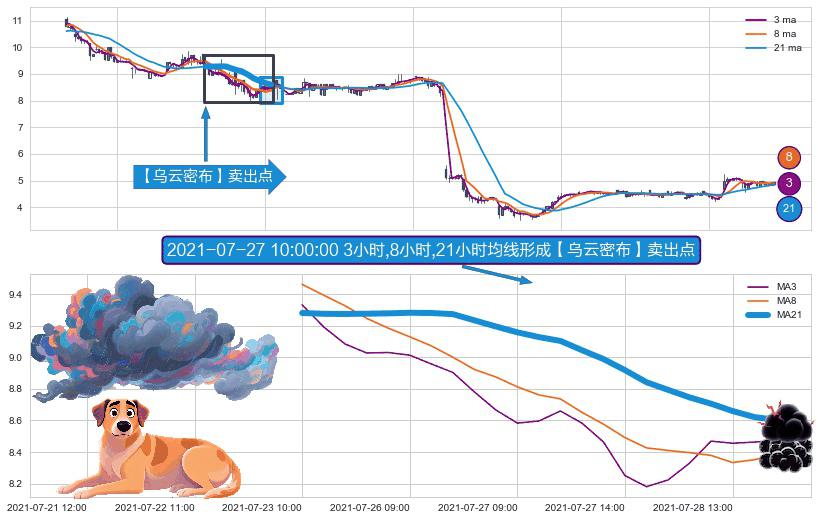 ⚀ 2021-07-23 10:00:00小时-2021-07-28 15:00:00小时显现 3小时-8小时-21小时均线 【乌云密布】卖出点 看空信号,后市看跌,卖出