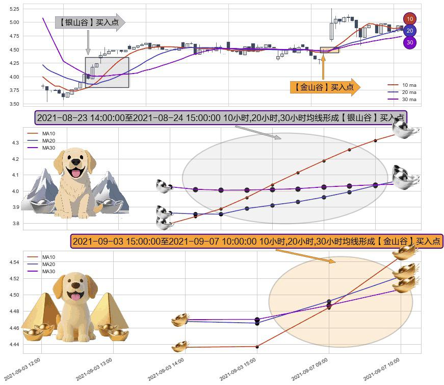 ⚃ 2021-09-07 09:00:00-小时至2021-09-07 10:00:00-小时显现 10小时-20小时-30小时均线 【金山谷】买入点 其再次确认了买入信号,可靠性更强,买入