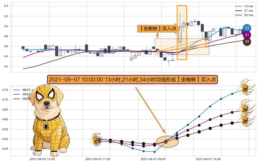 ⚀ 2021-09-07 10:00:00小时显现 13小时-21小时-34小时均线 【金蜘蛛】买入点 看多信号,后市看涨,买入