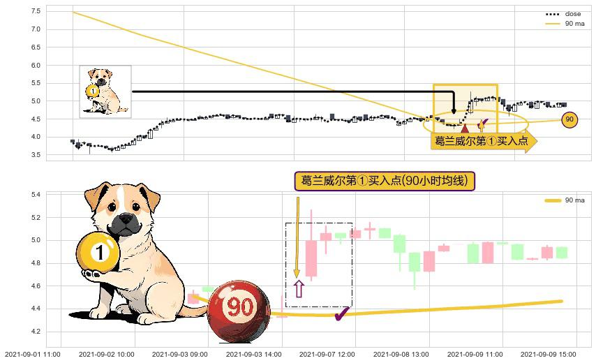 ⚀ 2021-09-03 15:00:00-小时显现 葛兰威尔均线 90小时均线 第买①入点 走势反转见底信号,后市看涨,买进信号
