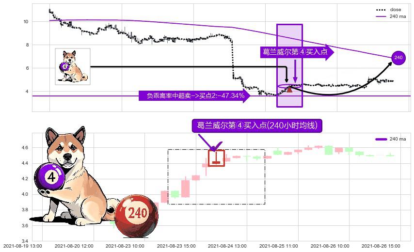⚀ 2021-08-24 10:00:00-小时显现 葛兰威尔均线 240小时均线 第④买入点 下降趋势均值回复的短线反弹信号,后市看涨,买进信号