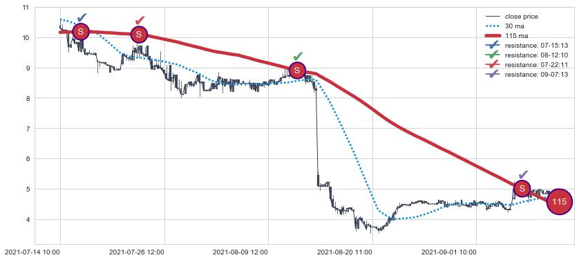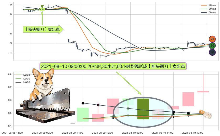 ⚀ 2021-08-10 09:00:00小时显现 20小时-30小时-60小时均线 【断头铡刀】卖出点 看空信号,后市看跌,卖出