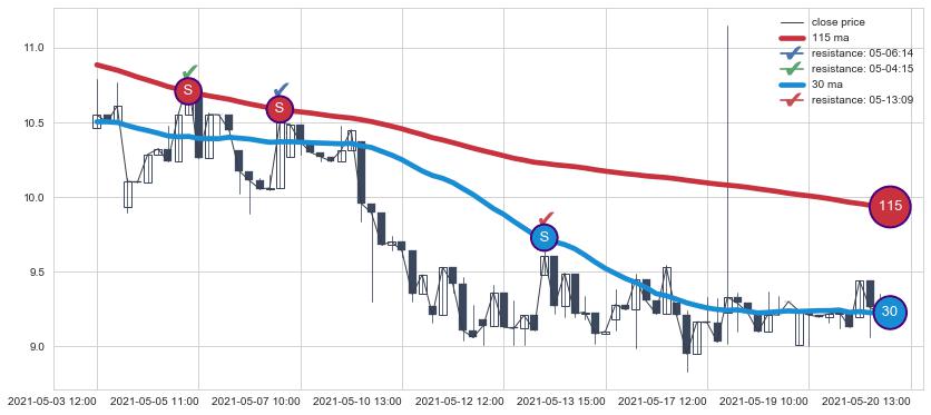 ➢ 最优均线组合共正确确认支撑阻力信号9处,正确确认率 90.00%