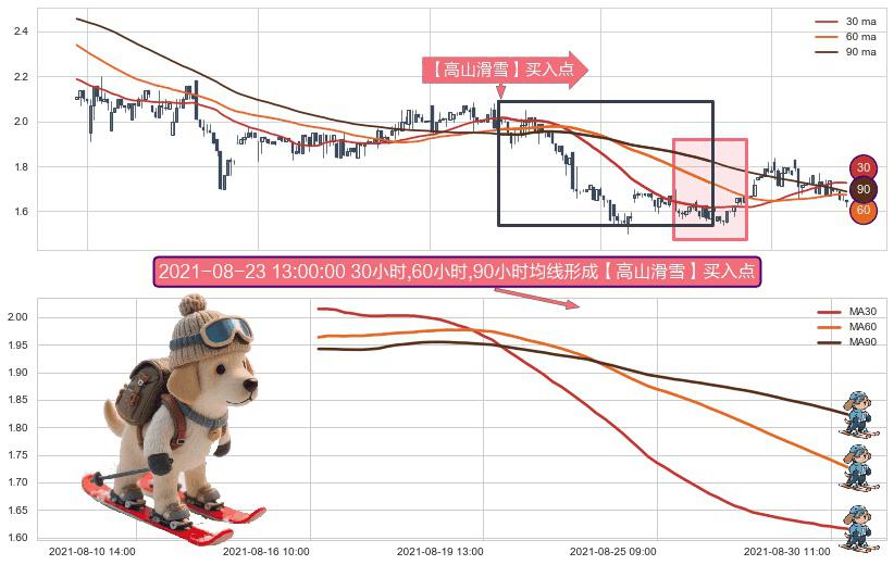 ⚀ 2021-08-16 11:00:00小时-2021-08-30 13:00:00小时显现 30小时-60小时-90小时均线 【高山滑雪】买入点 看多信号,后市看涨,买入