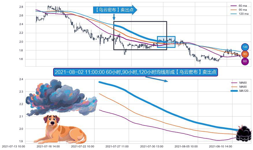 ⚀ 2021-07-22 13:00:00小时-2021-08-11 13:00:00小时显现 60小时-90小时-120小时均线 【乌云密布】卖出点 看空信号,后市看跌,卖出