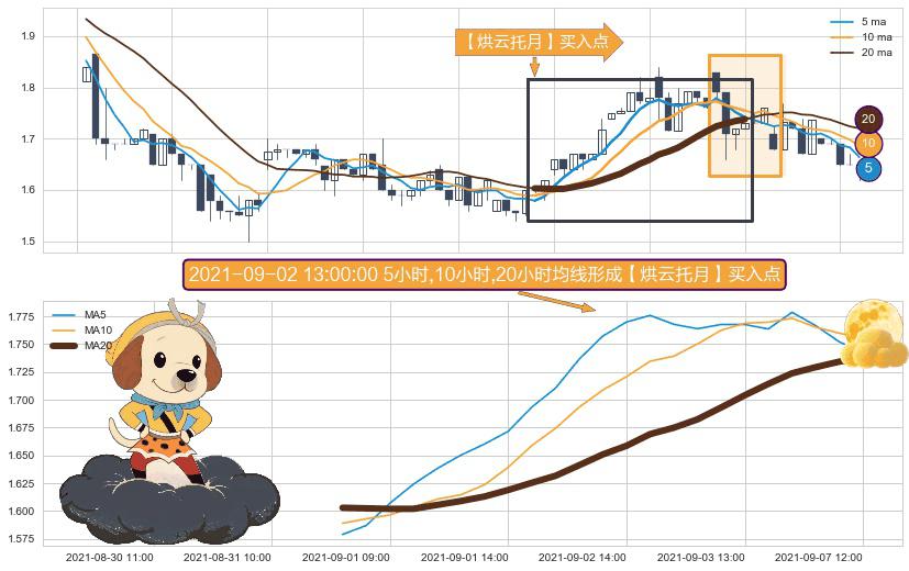 ⚀ 2021-08-31 13:00:00小时-2021-09-07 12:00:00小时显现 5小时-10小时-20小时均线 【烘云托月】买入点 看多信号,后市看涨,买入