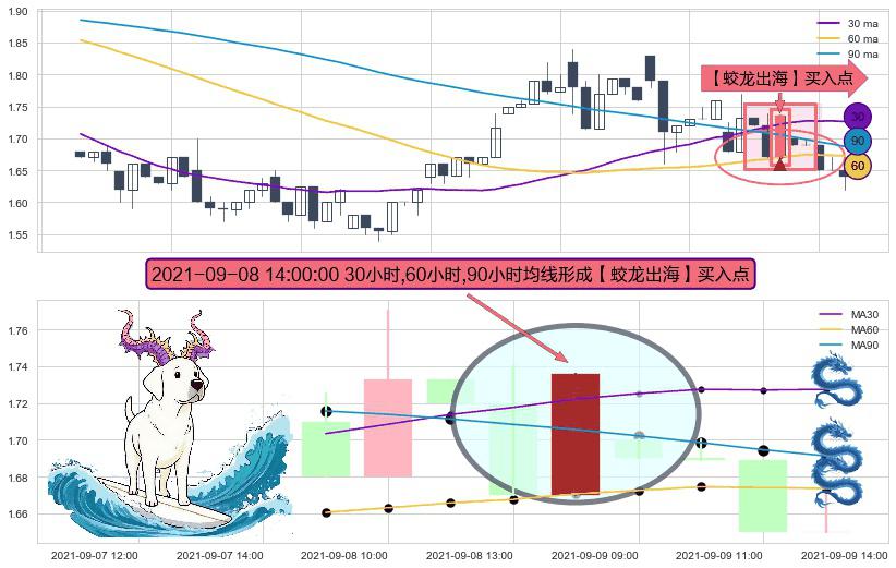 ⚀ 2021-09-08 14:00:00小时显现 30小时-60小时-90小时均线 【蛟龙出海】买入点 看多信号,后市看涨,买入