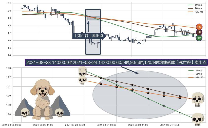 ⚀ 2021-08-24 09:00:00-小时至2021-08-24 14:00:00-小时显现 60小时-90小时-120小时均线 【死亡谷】卖出点 看空信号,后市看跌,卖出