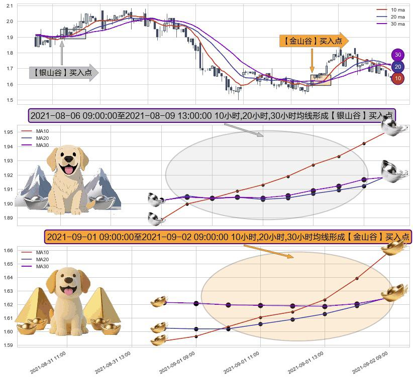 ⚃ 2021-09-01 10:00:00-小时至2021-09-02 09:00:00-小时显现 10小时-20小时-30小时均线 【金山谷】买入点 其再次确认了买入信号,可靠性更强,买入