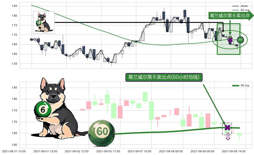 ⚀ 2021-09-09 11:00:00-小时显现 葛兰威尔均线 60小时均线 第⑥卖出点 走势反转见顶信号,后市看跌,卖出信号
