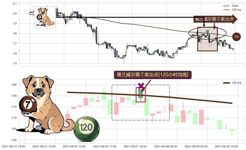 ⚀ 2021-09-07 09:00:00-小时显现 葛兰威尔均线 120小时均线 第⑦卖出点 下降趋势的中继信号,后市看跌,卖出信号
