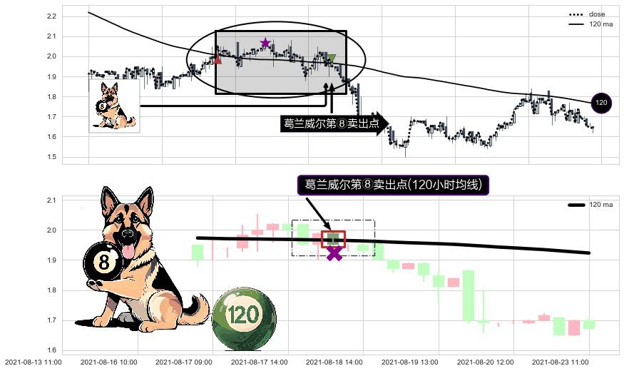 ⚀ 2021-08-18 11:00:00-小时显现 葛兰威尔均线 120小时均线 第⑧卖出点 下降趋势的中继信号,后市看跌,卖出信号