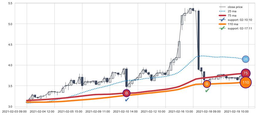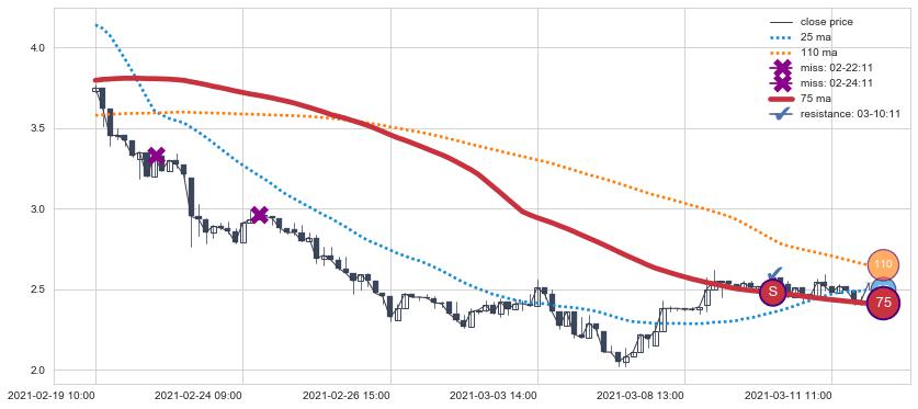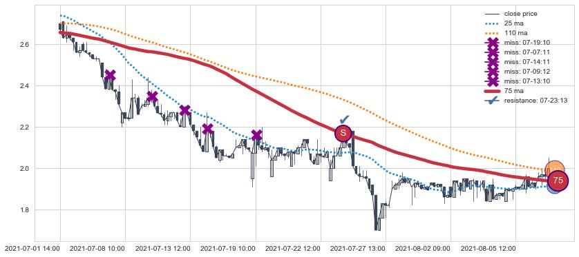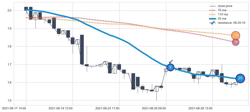⚂ 2021-08-09 14:00:00-小时均线向上突破,2021-08-18 11:00:00-小时重新下穿均线破位,均线阻力再次生效
