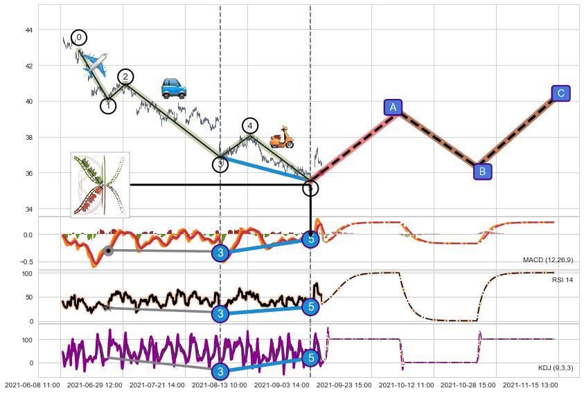 ➣ 1,3,5驱动浪MACD, RSI, KDJ走势都出现【常规背离】反转信号增强