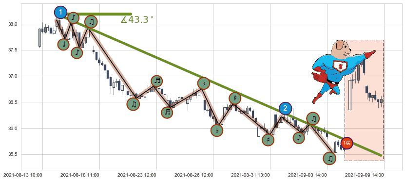 从2021-08-16 09:00至2021-09-08 09:00,共包含104个小时,阶段股价下跌-2.93%,阶段股价变动位移路程比: 1 : 9,下跌趋势角度: 43.3