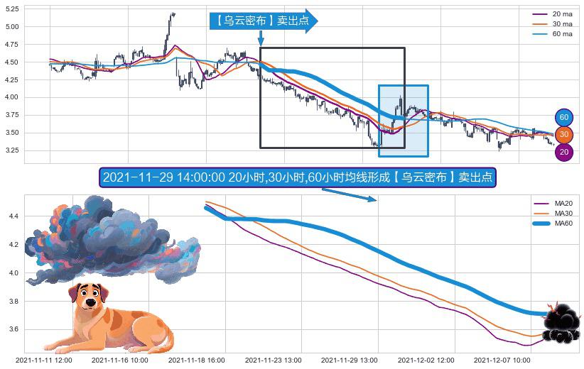 形态多维评估: ⚀ 2021-11-18 11:00:00小时-2021-12-07 16:00:00小时显现 20小时-30小时-60小时均线 【乌云密布】卖出点 看空信号,后市看跌,卖出