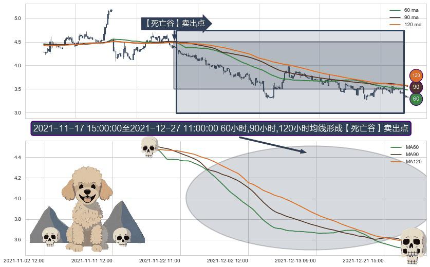 形态多维评估: ⚀ 2021-11-18 09:00:00-小时至2021-12-27 11:00:00-小时显现 60小时-90小时-120小时均线 【死亡谷】卖出点 看空信号,后市看跌,卖出
