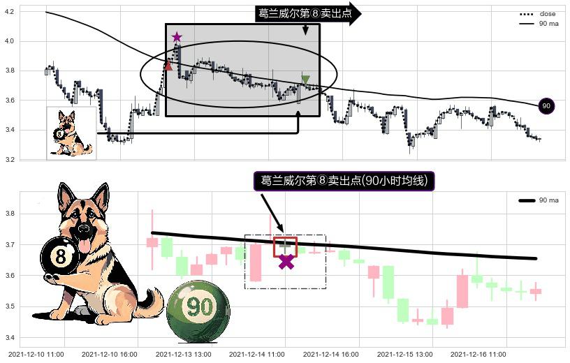 形态多维评估: ⚀ 2021-12-14 11:00:00-小时显现 葛兰威尔均线 90小时均线 第⑧卖出点 下降趋势的中继信号,后市看跌,卖出信号