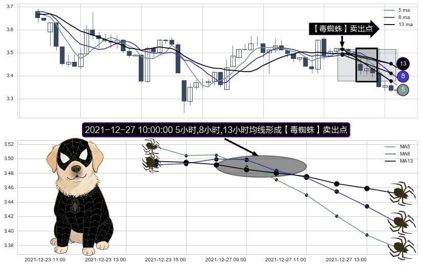 形态多维评估: ⚀ 2021-12-27 10:00:00小时显现 5小时-8小时-13小时均线 【毒蜘蛛】卖出点 看空信号,后市看跌,卖出