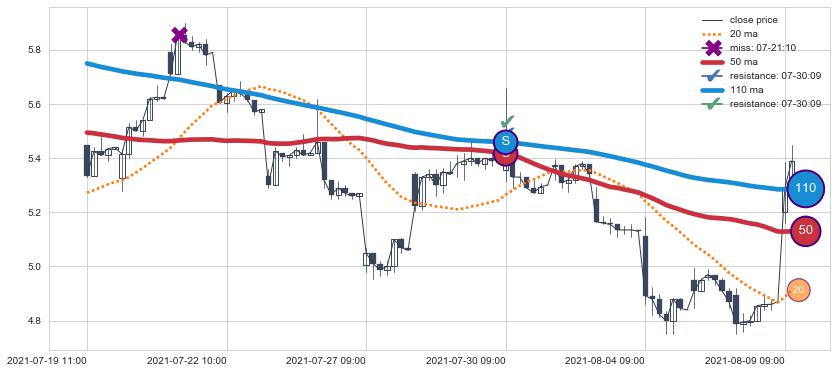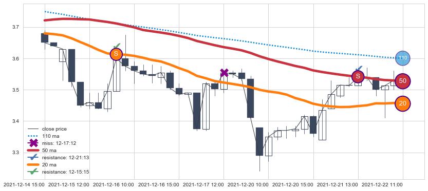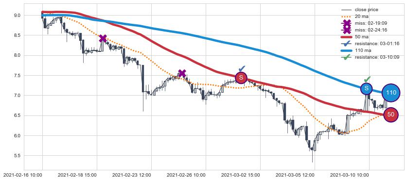 下跌趋势02-16 10:00-03-11 09:00,均线50, 110确认关键阻力2处