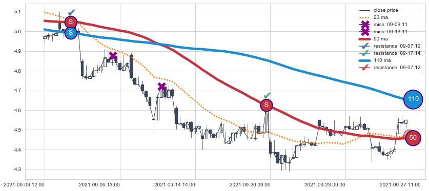 下跌趋势09-03 12:00-09-27 11:00,均线50, 110确认关键阻力2处