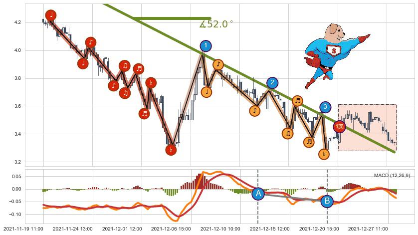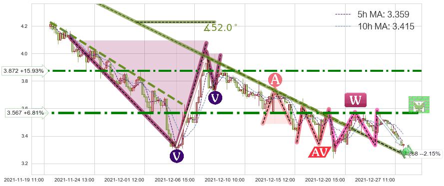 ⚔️ 2021-11-19 14:00-2021-12-21 12:00下跌趋势存在反转上涨[机会],虽然原下跌趋势的阻力位(3.268)已被突破,但其阻力效果尚存,原下跌趋势角度: 52.0˚