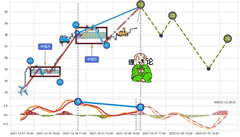 ➣ 【中枢A】:12-08:09-12-09:11,中枢由4笔构成,共10交易小时, ZG=54.98, ZD=54.70